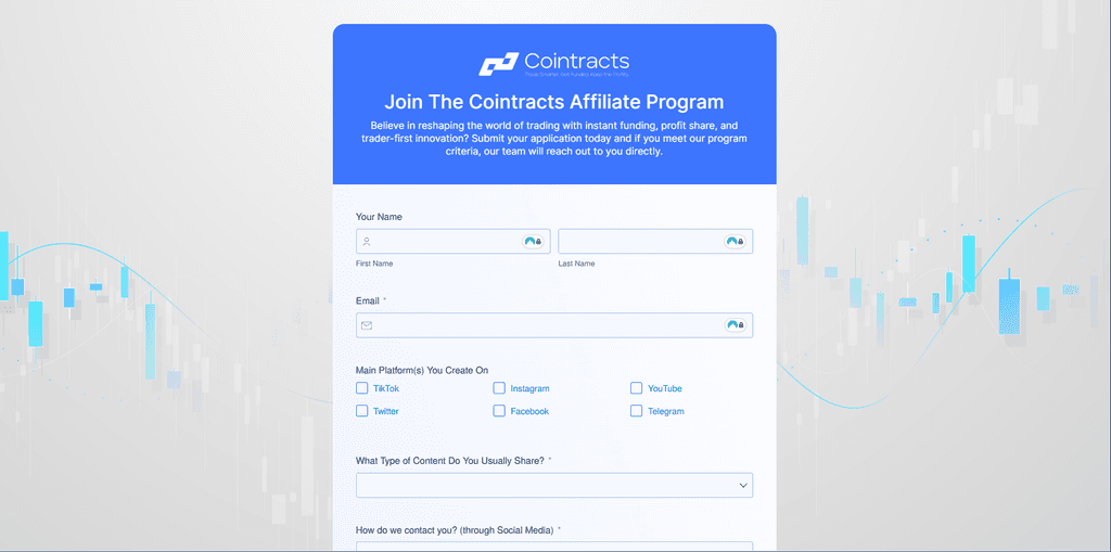 Collaborate directly with Cointracts as a trusted voice in trading. Earn competitive payouts for driving high-quality traders and enjoy custom partnership terms.